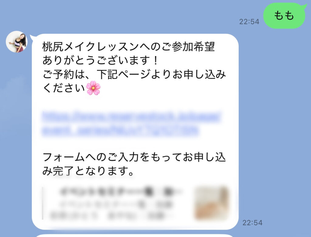 下記の公式LINEアカウントを友だち追加後「もも」とお送りください。他のワードは入れず、以下のように「もも」のみお送りください。